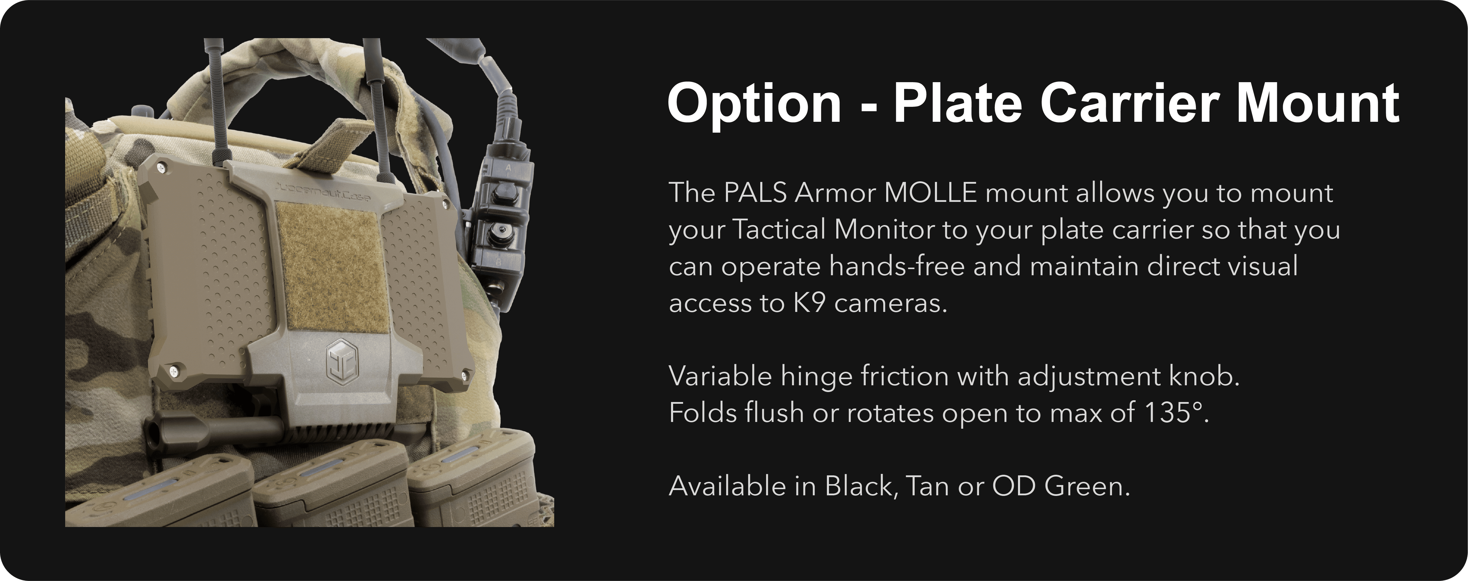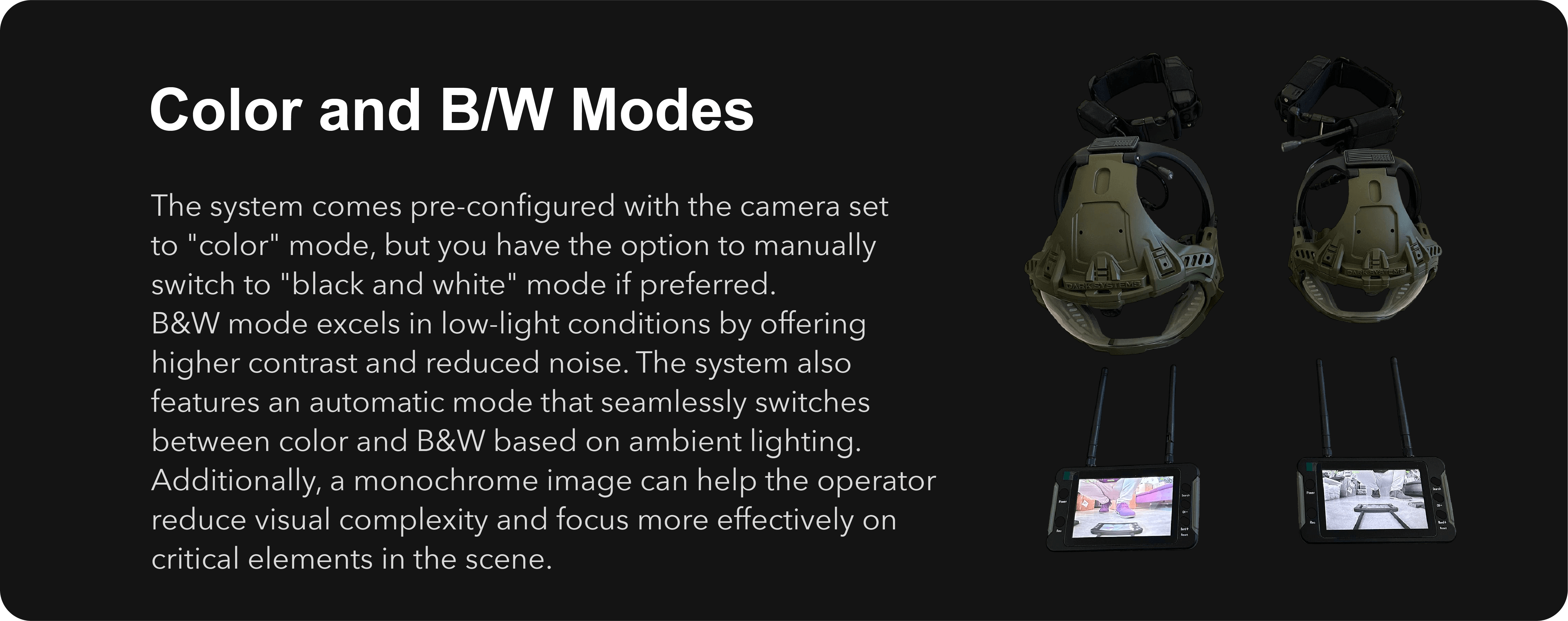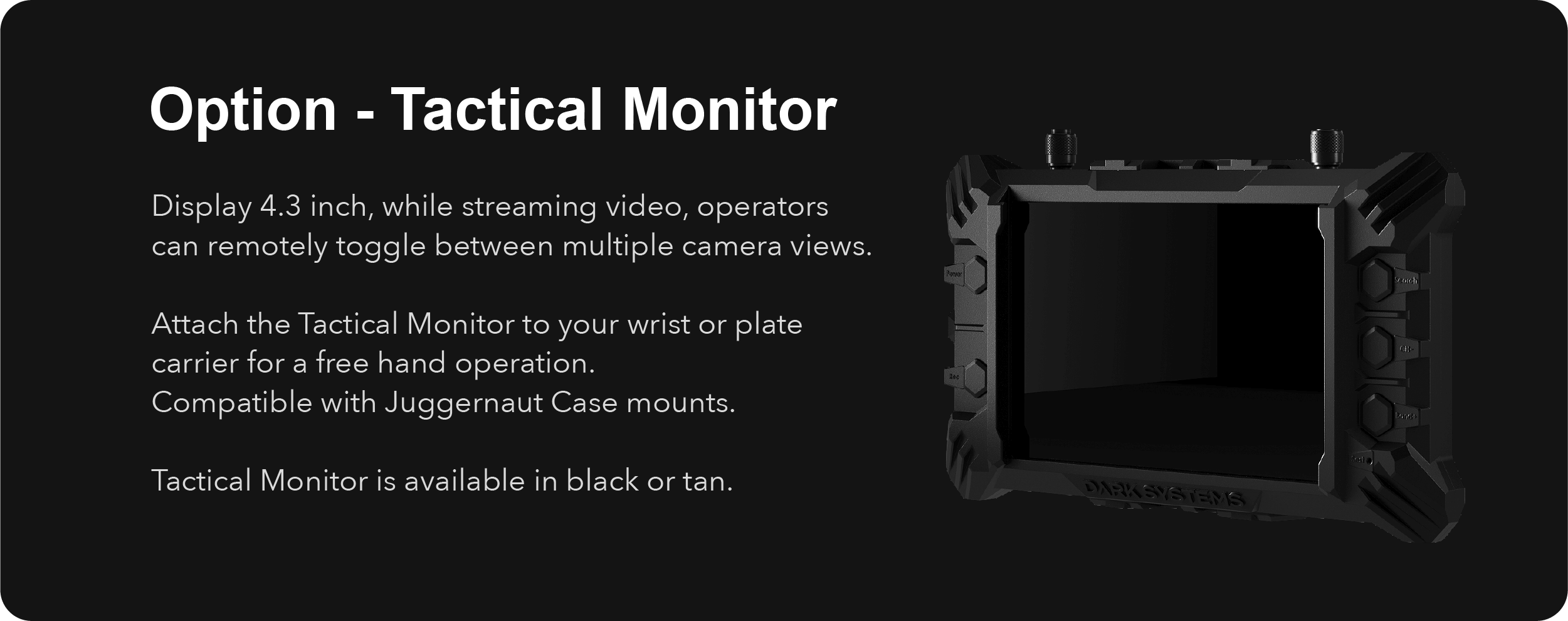 The tactical monitor is equipped with low-profile antennas to maintain a compact and rugged system that does not interfere with the operator’s equipment.