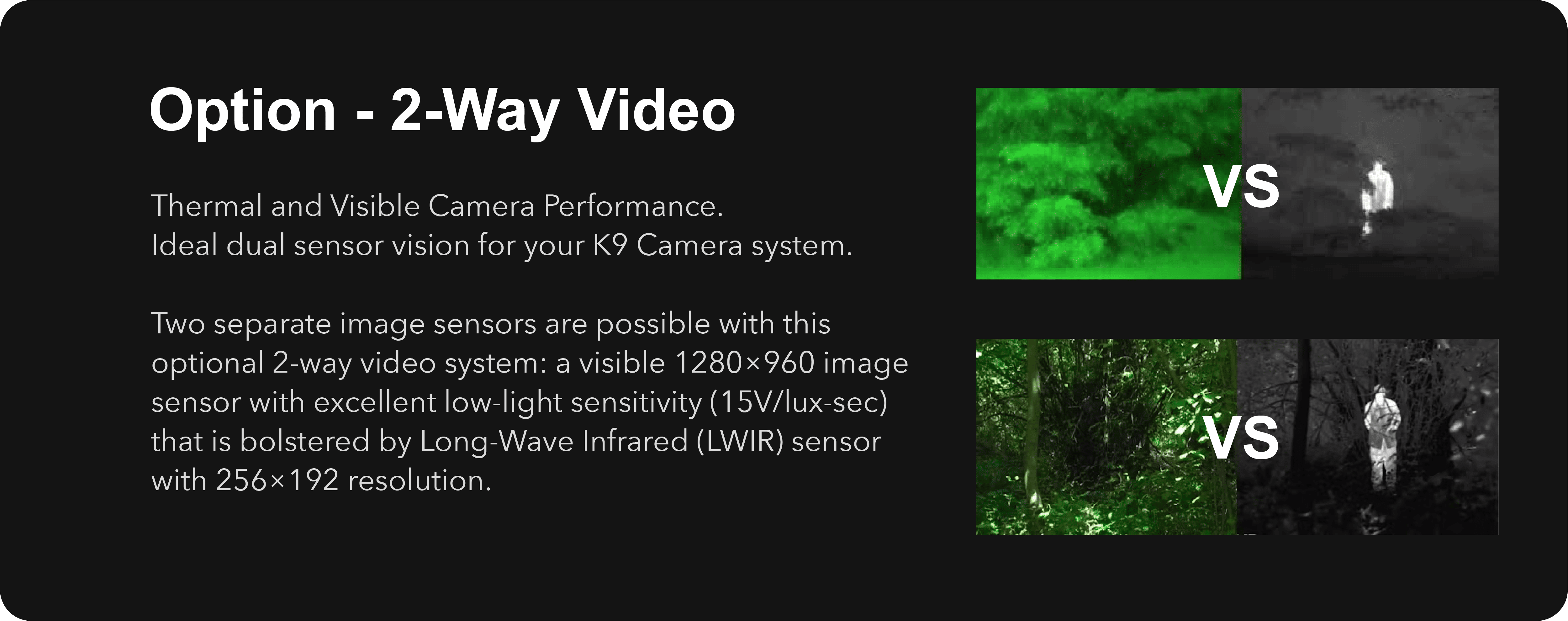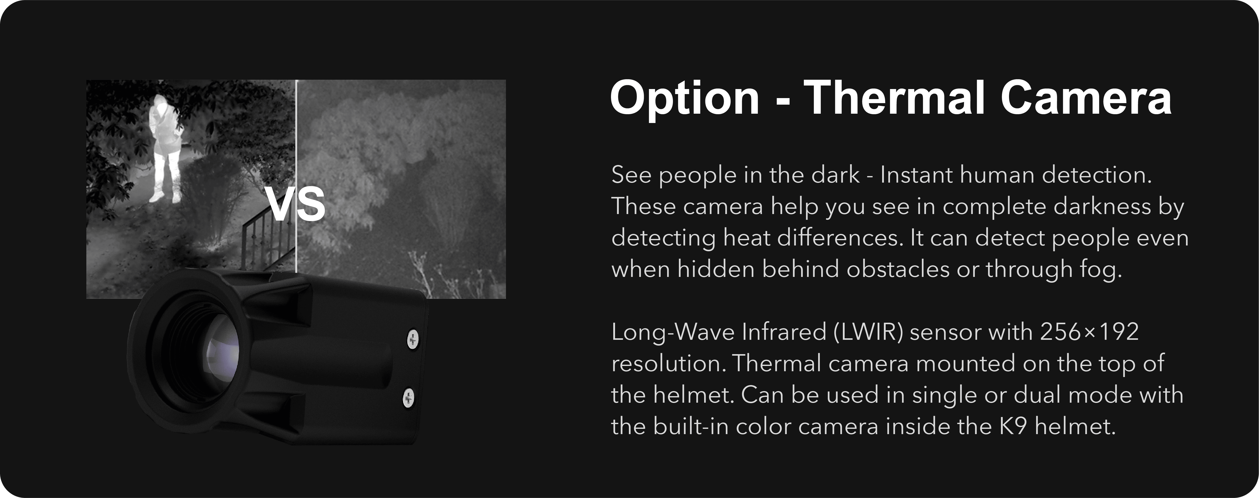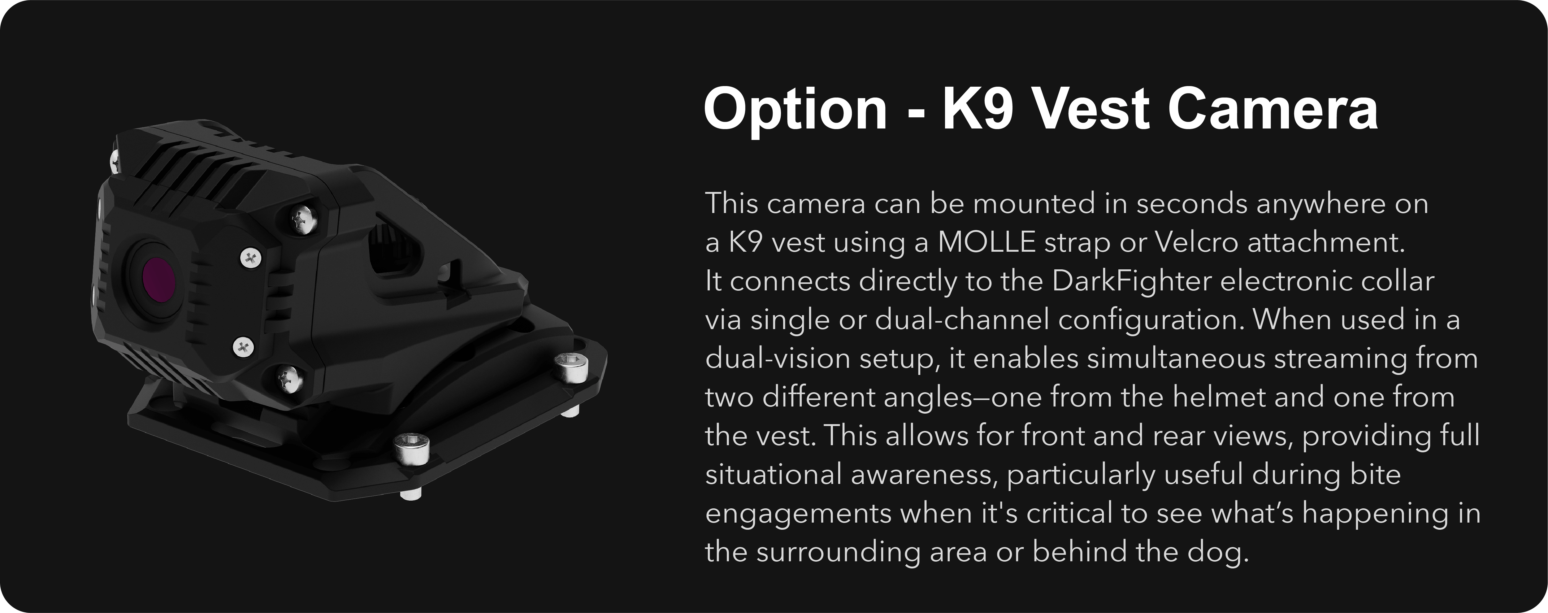 The DarkFighter Built-In K9 Camera system can now deliver panoramic vision with two cameras operating simultaneously. The system is fully modular—you can add the K9 Vest Camera to your harness for a wide-angle front view or a rear view. This camera works in perfect complement with the helmet-integrated Built-In K9 Camera or the thermal camera mounted on the helmet’s mini rail.