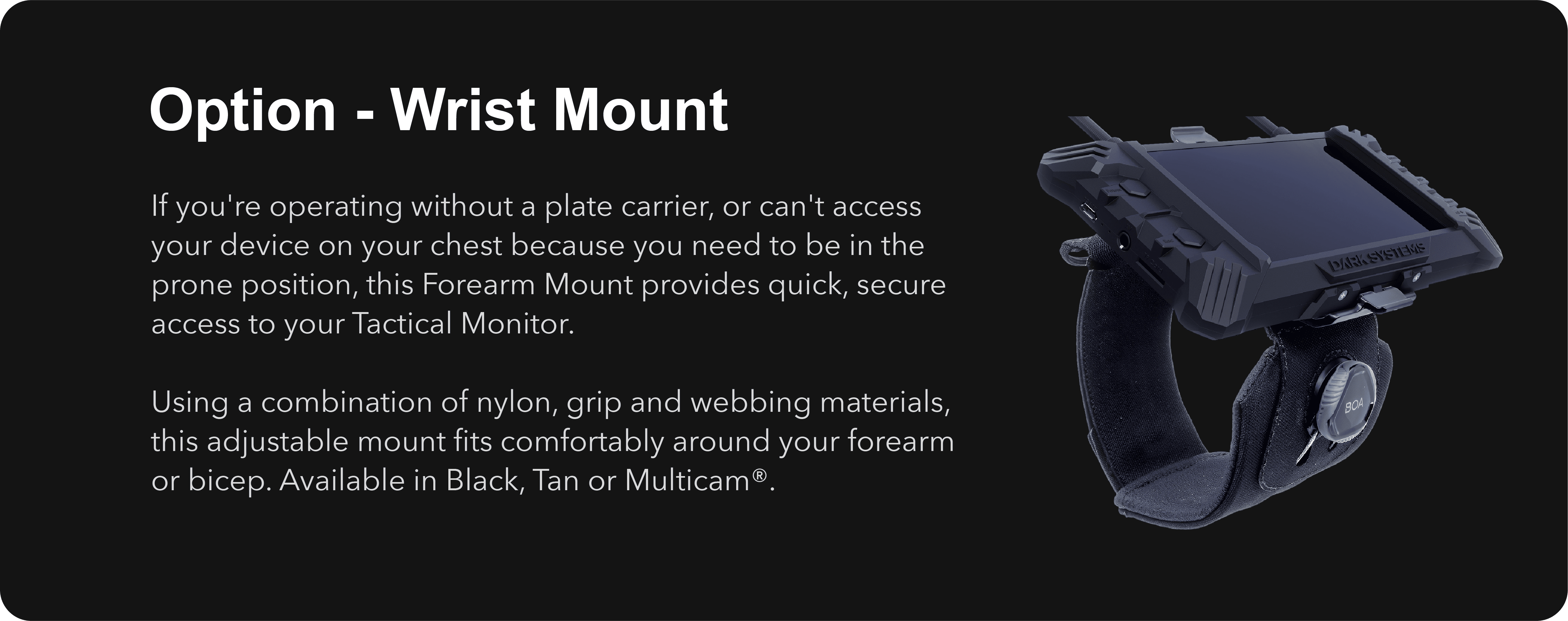Using a combination of nylon, grip and webbing materials, this adjustable mount fits comfortably around your forearm or bicep. The Boa Fit System prevents it from rotating or sliding around.