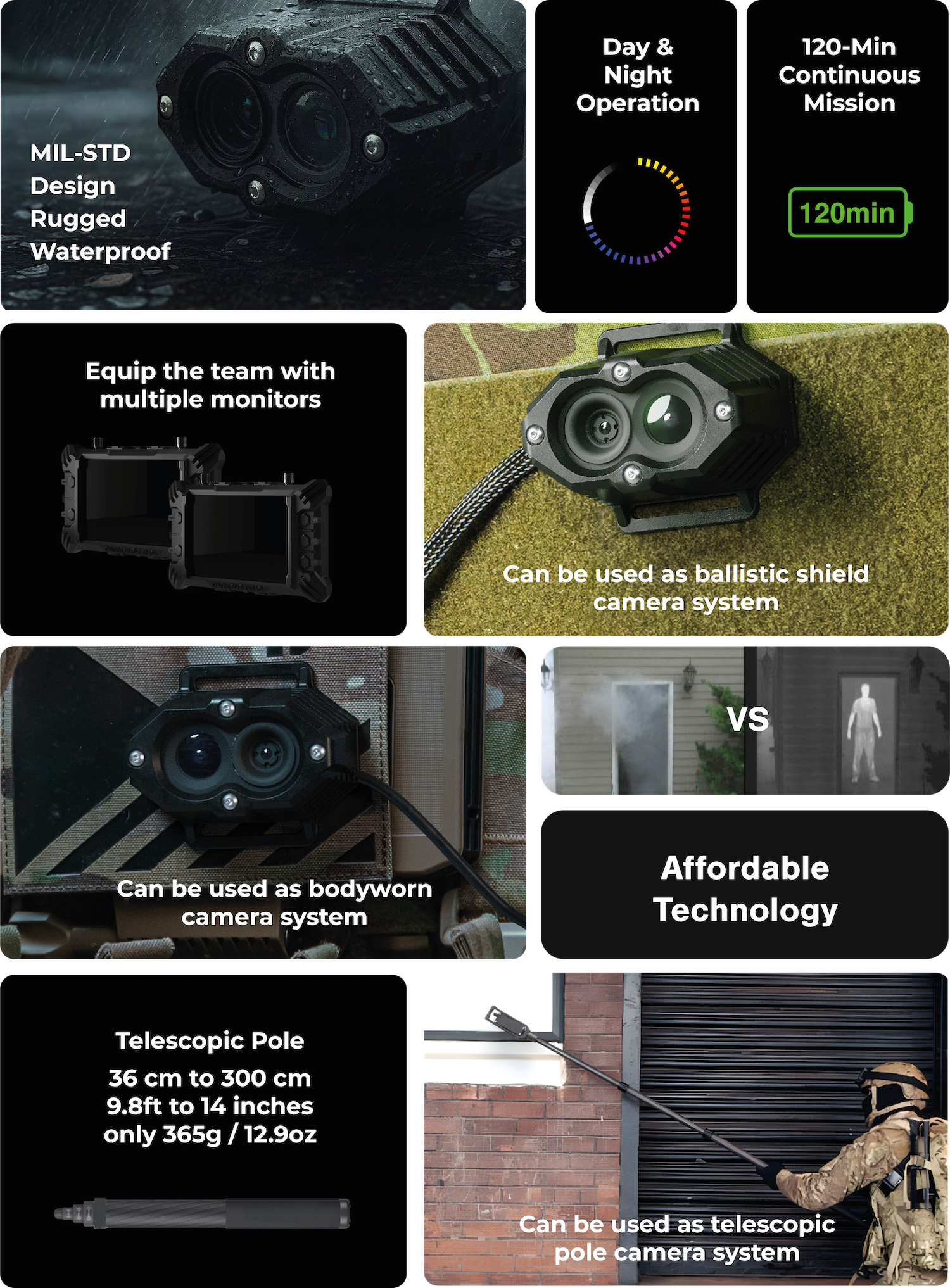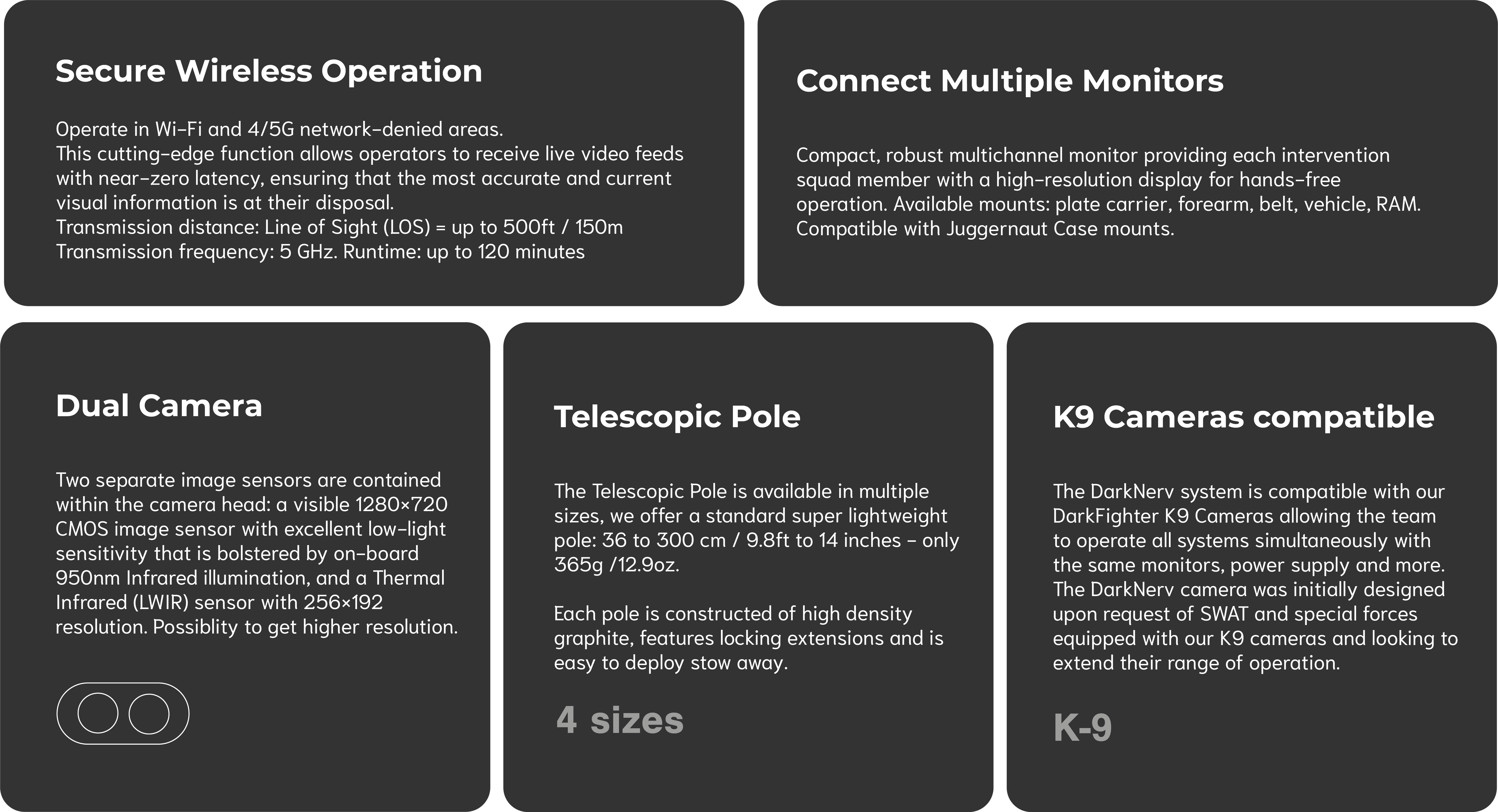 DarkNerv tactical camera's application flexibility is further demonstrated by its ability to be mounted on a range of supports, including ballistic shields, telescopic poles, tripods, human-user equipment. This adaptability ensures that it can be quickly deployed in the most demanding situations without the need for tools, thanks to its plug-and-play design.